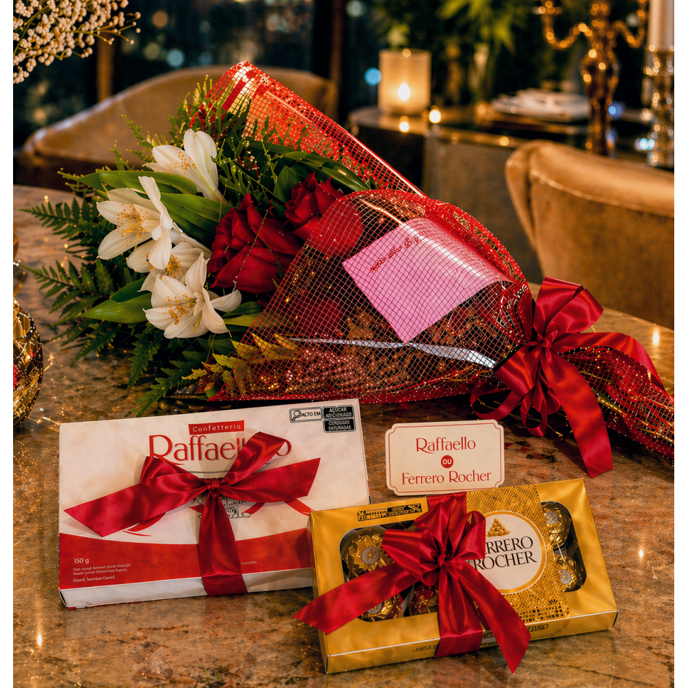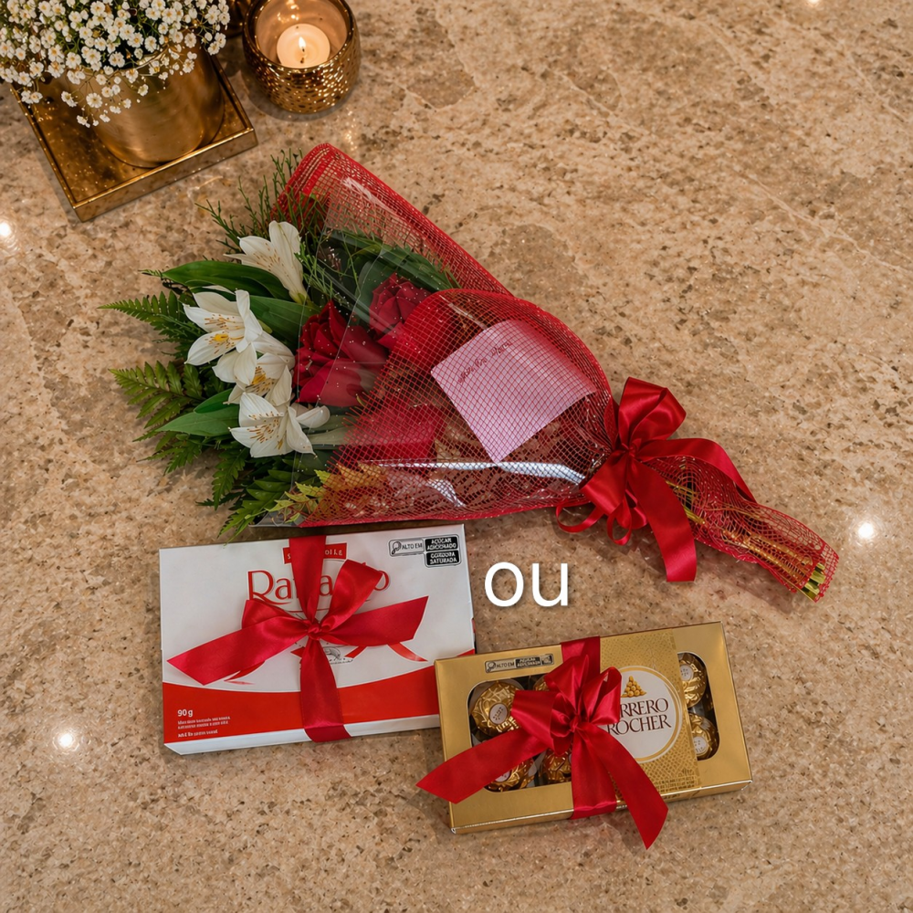 Ramalhete composto por 3 Rosas Vermelhas ou Cor de Rosas e caixa de bombons Ferrero Rocher 100g ou Raffaello 90g.