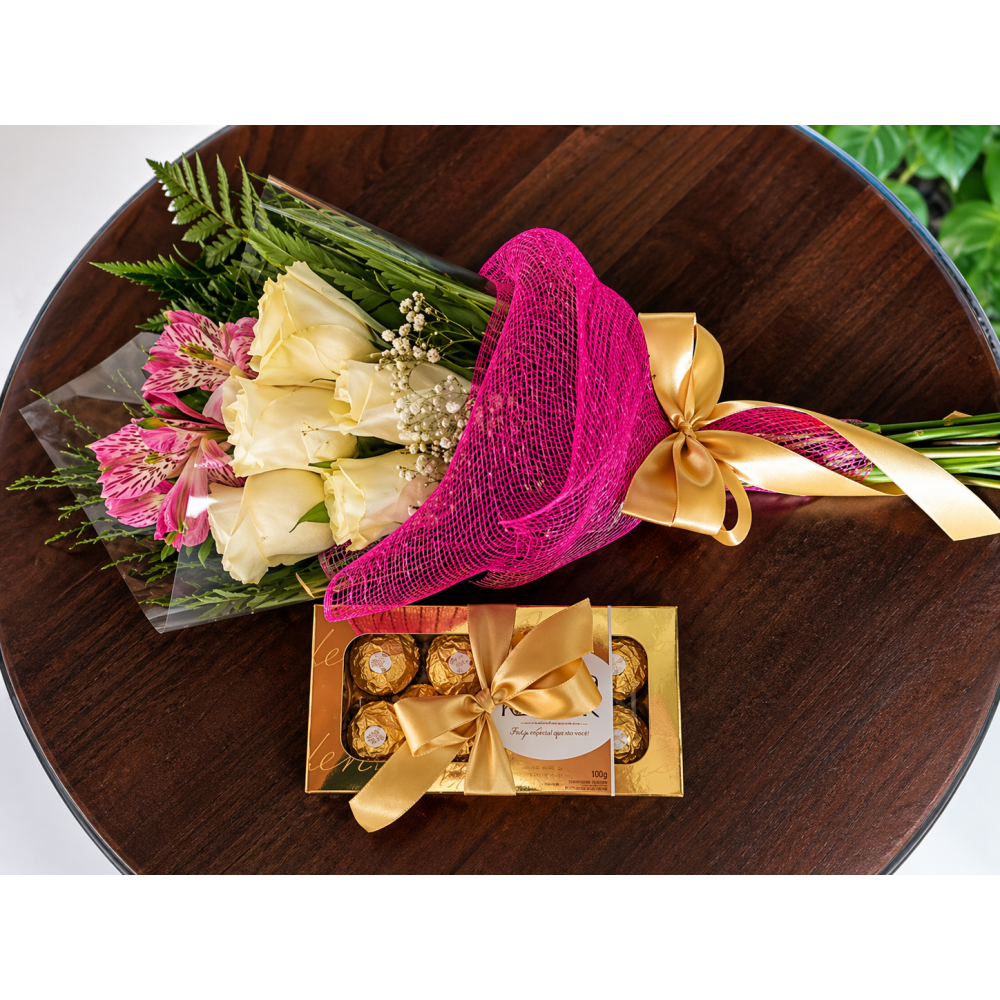 Ramalhete composto por 5 Rosas brancas e complementos,