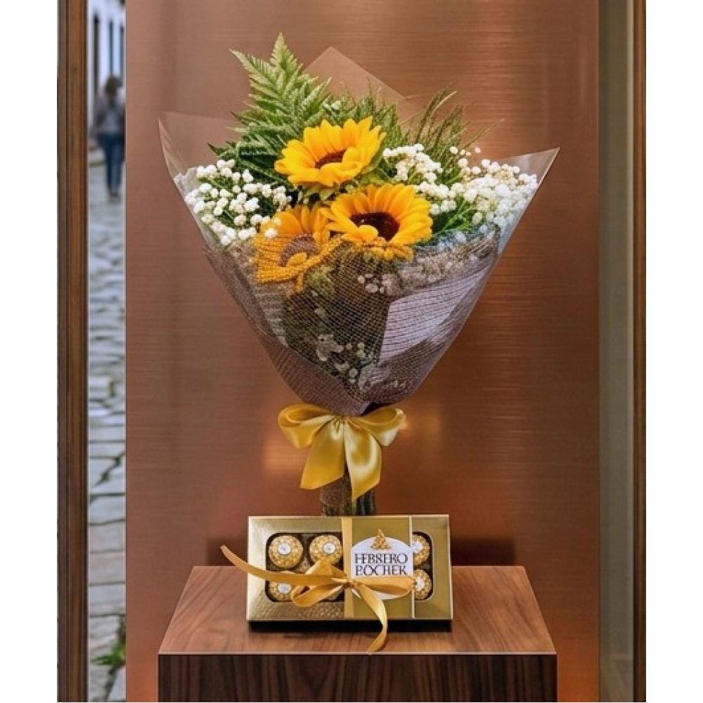 Buquê de Girassóis tamanho médio e Bombons Ferrero Rocher 100g.