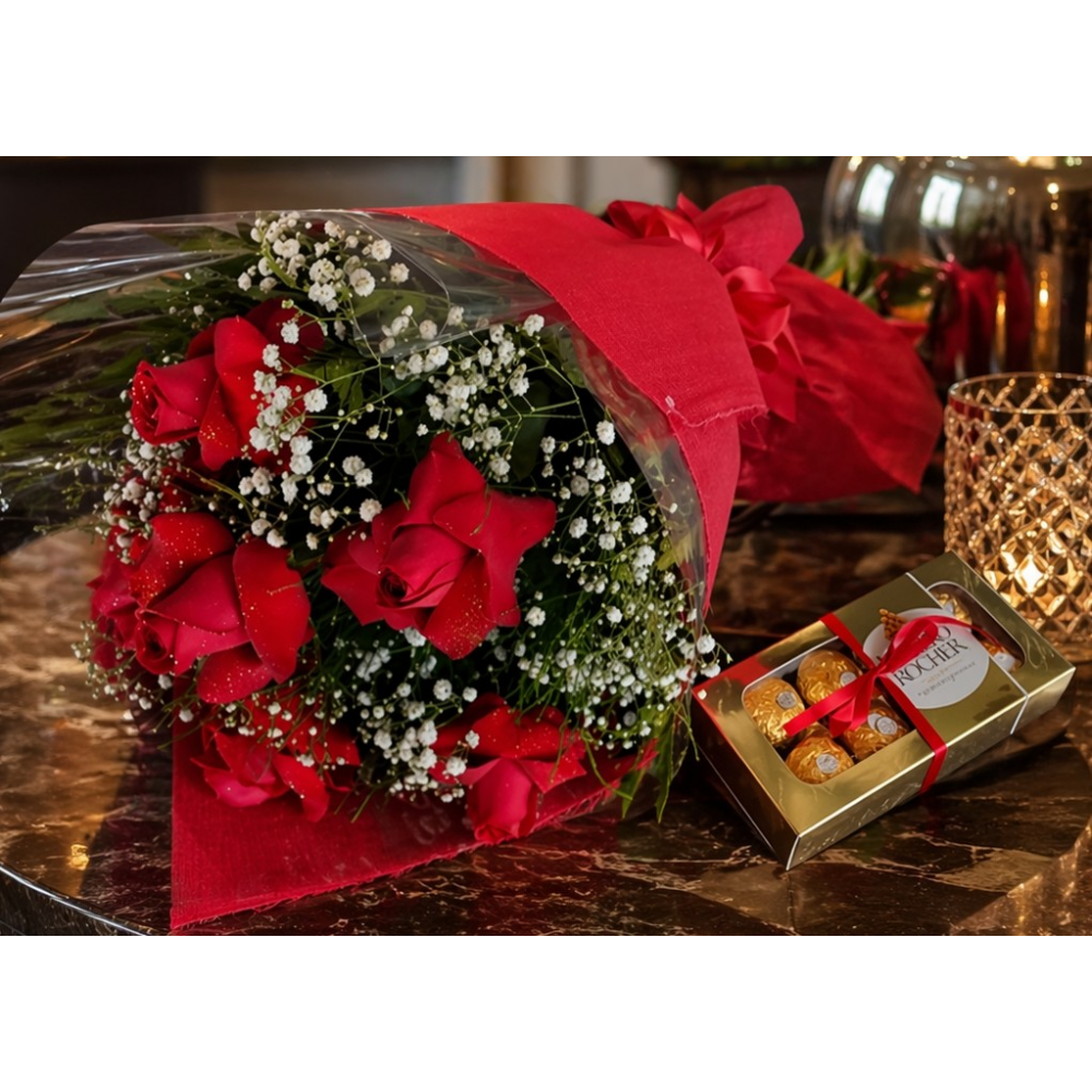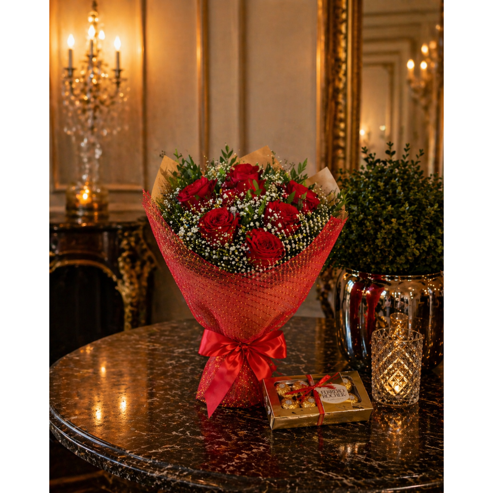 Buquê composto por 6 Rosas Vermelhas importadas e Caixa de bombons Ferrero Rocher 100g ou Rafaello.