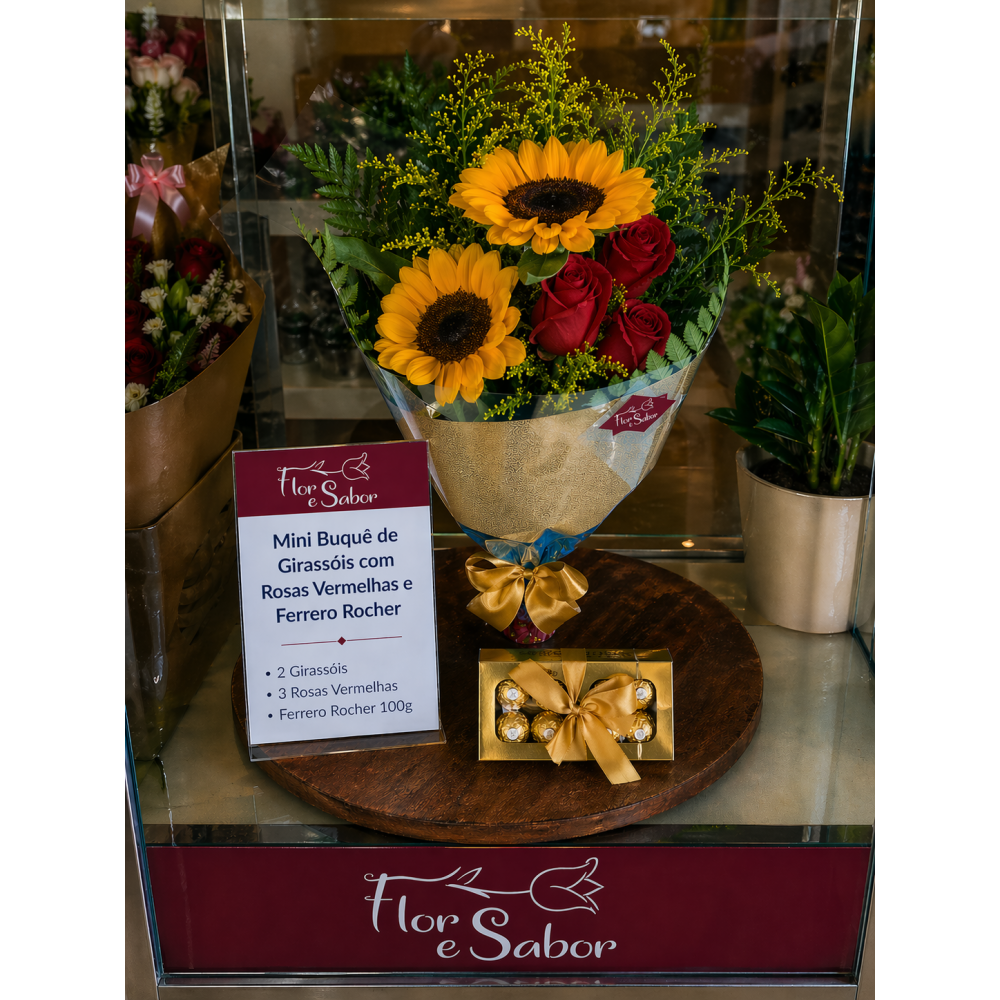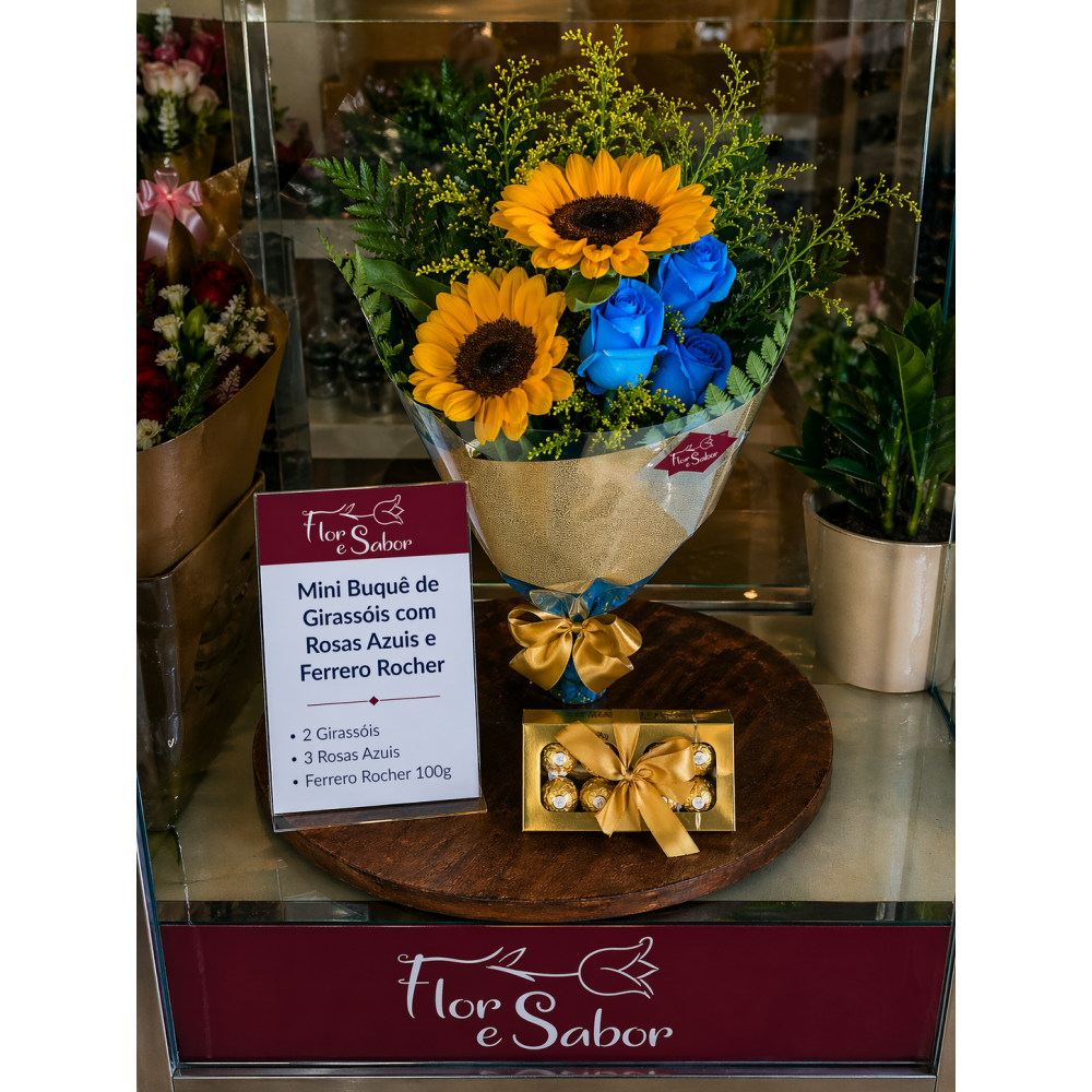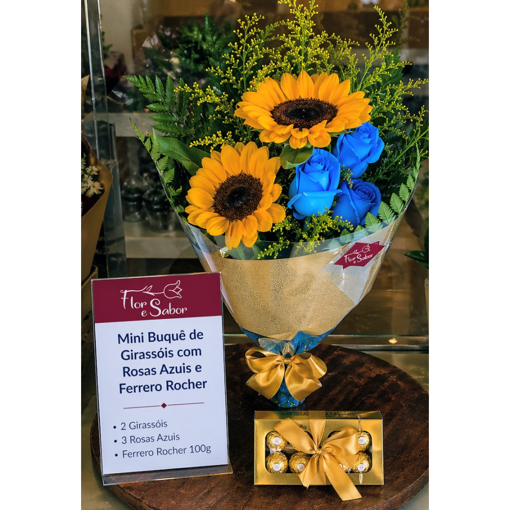Buquê composto por 2 Girassóis e 3 Rosas Azuis e caixa de Bombons Ferrero Rocher 100g.