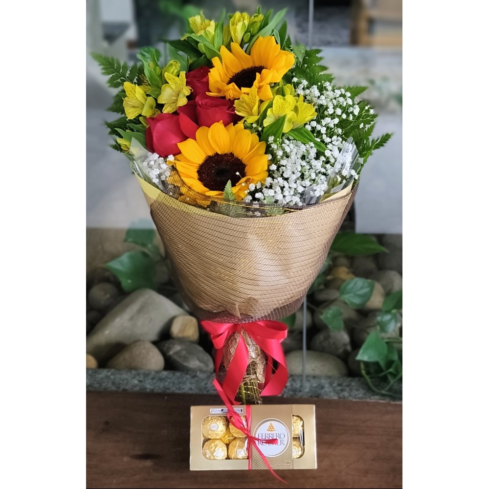 Buquê composto por 2 Girassóis e 3 Rosas Azuis e caixa de Bombons Ferrero Rocher 100g.